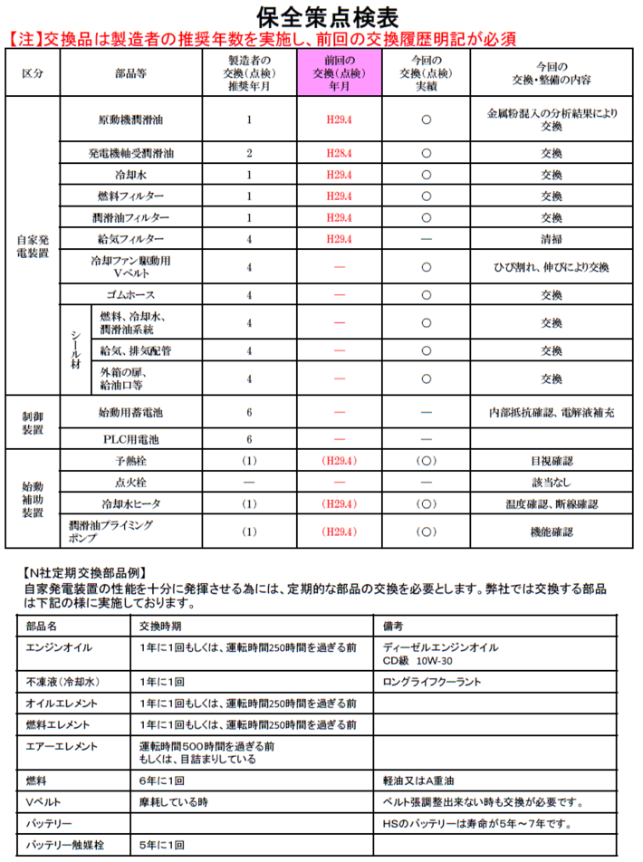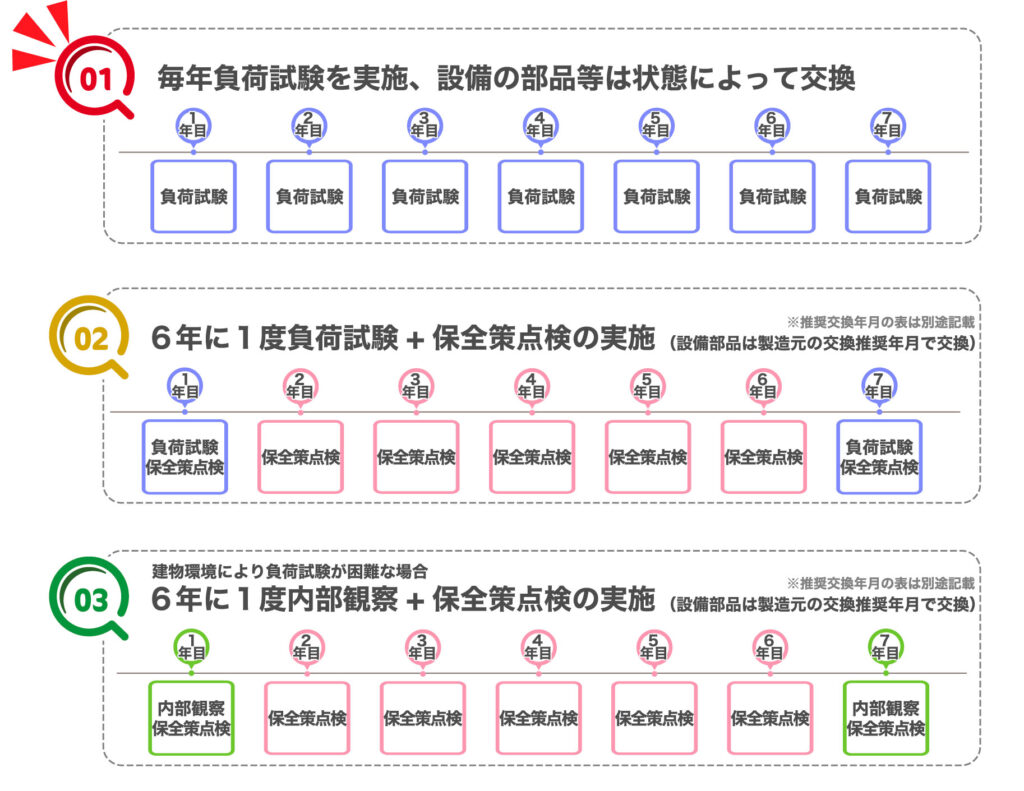 6年に1回の負荷試験、それによって新たに義務付けられたのが『保全策点検』。 こちらはこれまで毎年の負荷試験にて点検時、劣化したもの、交換が必要となった場合に交換していた設備の部品を、製造者の定めた推奨年月によって交換が必須となり、また交換したものを報告することが義務付けられました。